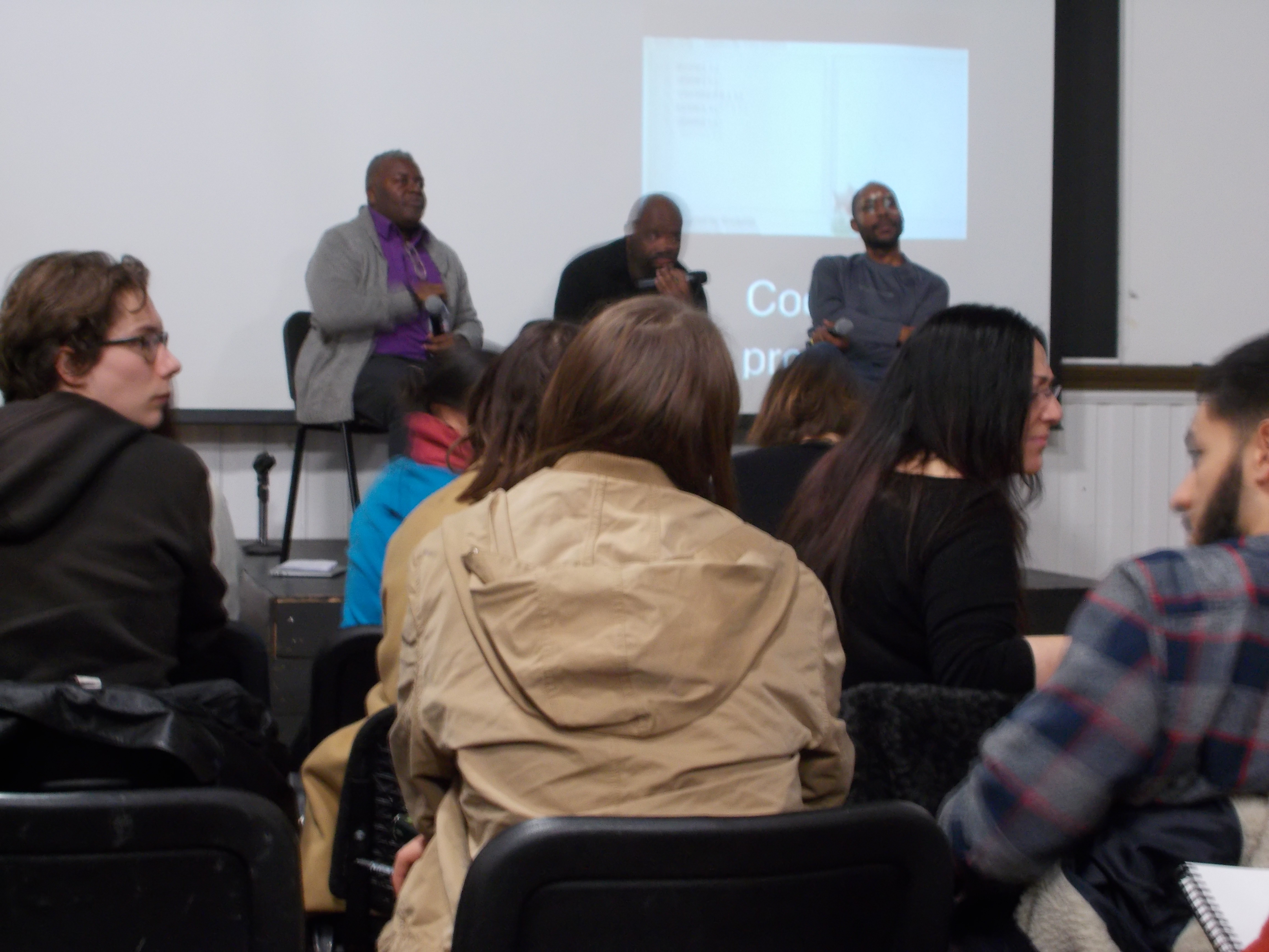 Keith Piper followed by sharing information about the genesis of two of his most challenging projects to address questions relating to the techno-cultural over the past 15 years: specifically, his multimedia installation piece ‘Robot Bodies’ (originally created in the late-1990s, and first displayed as ‘Robot Bodies: The Mechanoid’s Bloodline’ in 2001) – which featured a montage of text, film clips and audio-narration about fictional, cinematic sci-fi cyborgs and androids serving as metaphors of the black body as ‘Other’; and a more recent work (described as still in progress) titled ‘Code/’ (January, 2015). In this latter piece, Piper references the work of Jamaican-British technologist John Henry Thompson (inventor of the computer coding language ‘Lingo’/Macromedia in the 1990s) as a way of exploring ideas around the dynamism of human communications, hybrid (“patois”) language formations and ‘signifying (or “signifyin”) practices’.