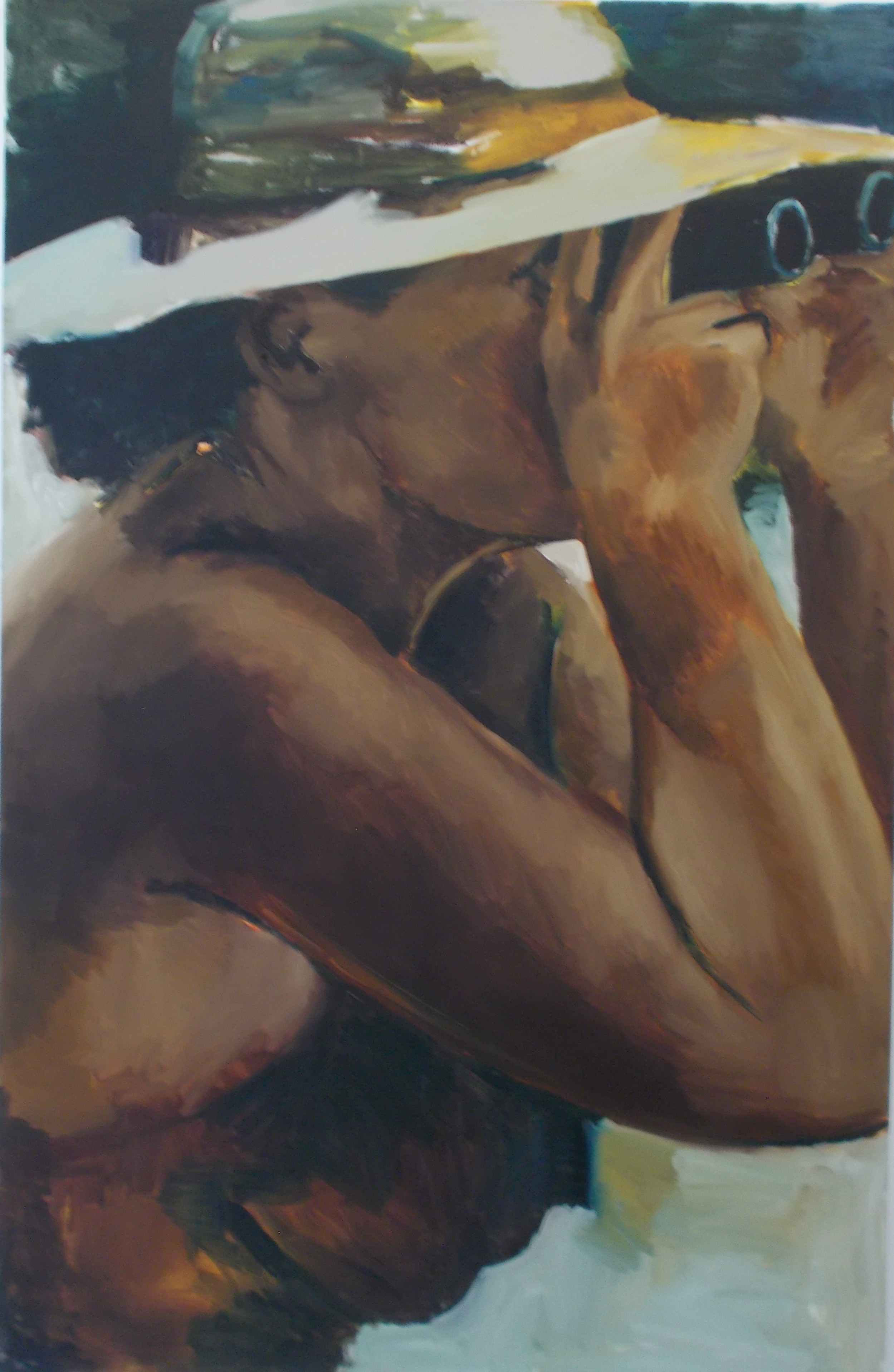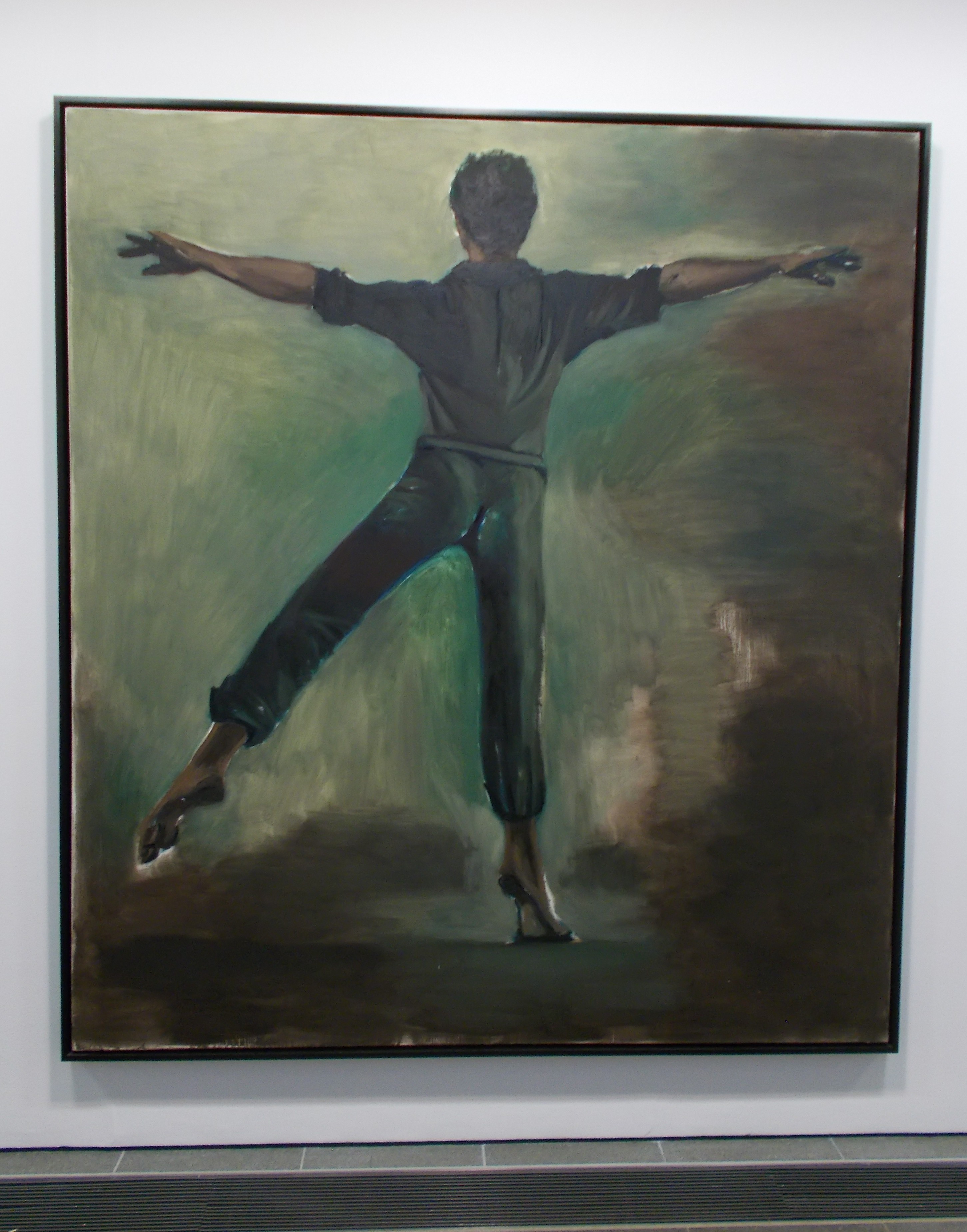 An impressive oil on canvas titled ‘Interstellar’ (2012) is positioned on the wall immediately facing the entrance to the first room so that a tall, larger-than-life figure of an athletic and graceful dancer, with arms outstretched in a balletic relevé on demi-point provides the first glimpse of Yiadom-Boakye’s sublime work. From the outset, the scale, energy and refinement of this painting drew me in and provoked many questions – not only concerning the subject in the frame, but also musings about the artist herself.