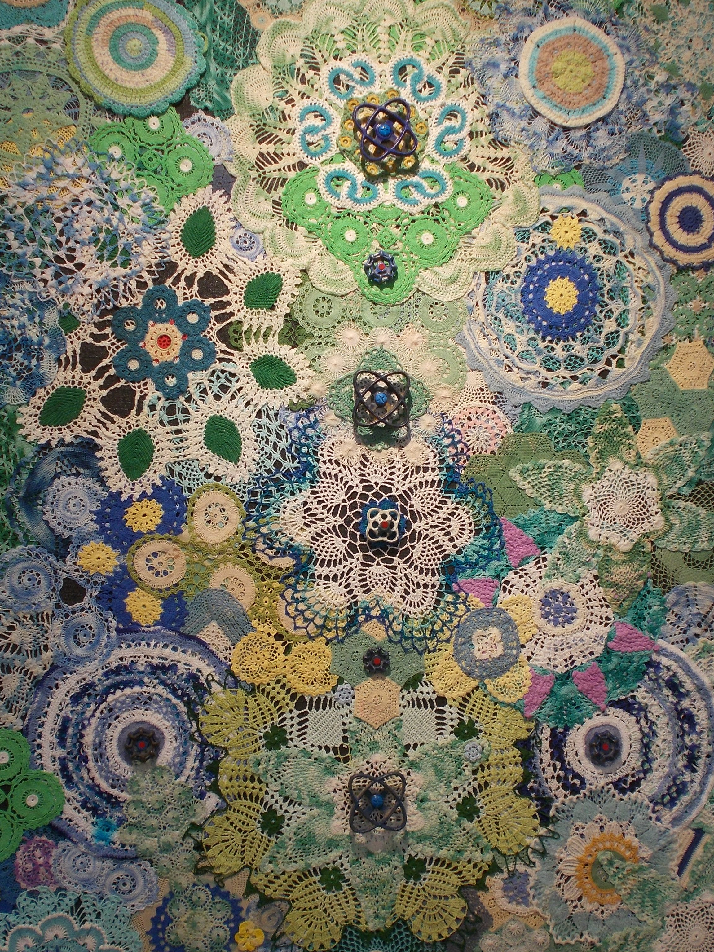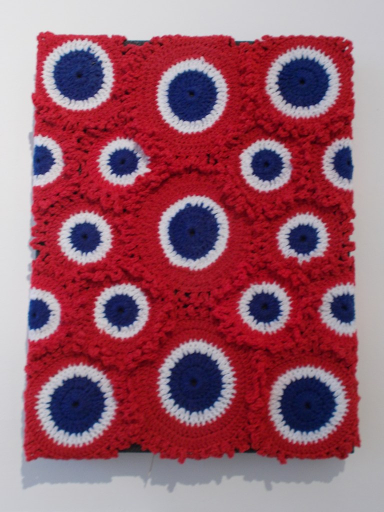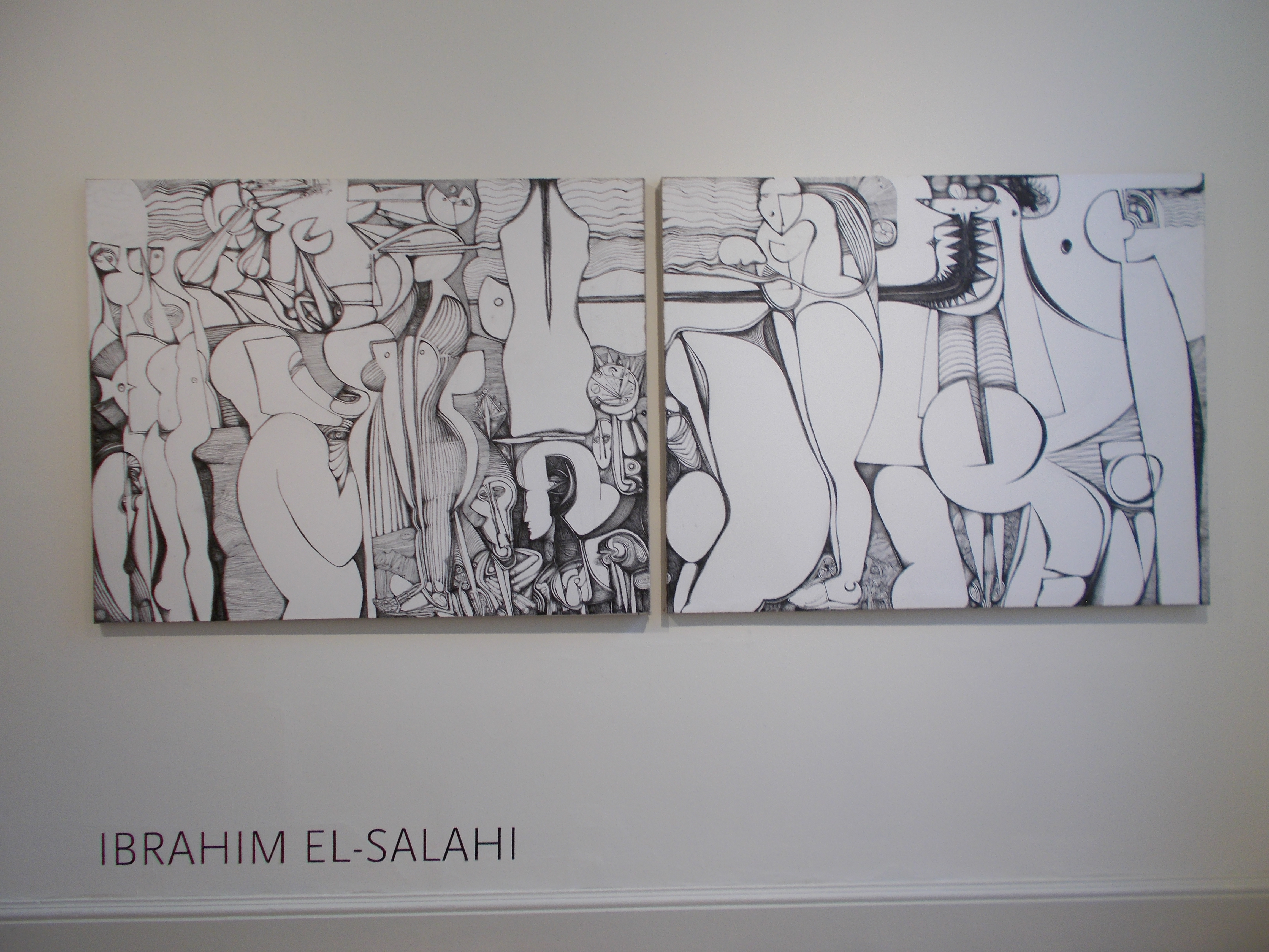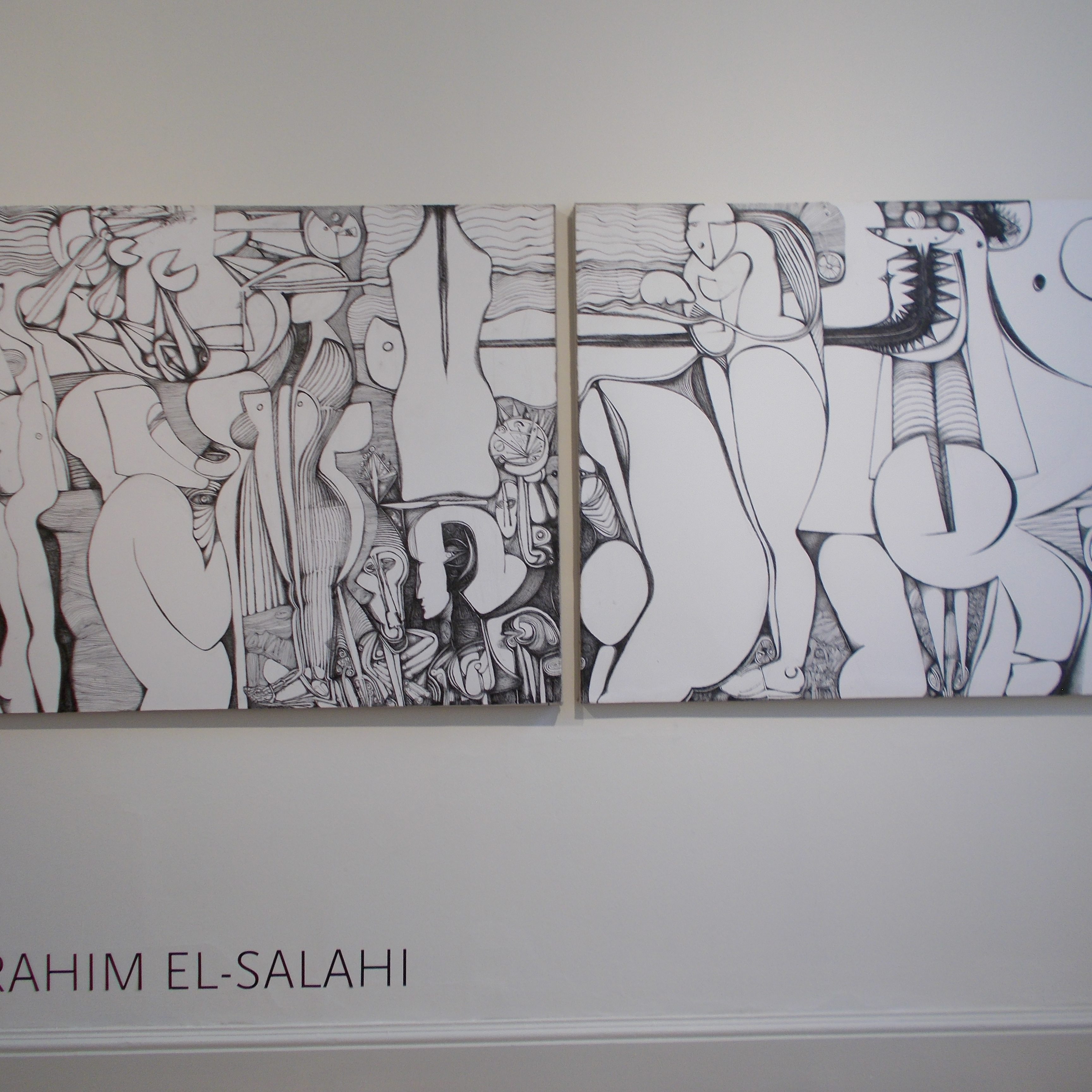 In addition to the large-scale installation, several more delicate pieces of collage work were displayed by the artist as part of the Vigo Gallery presentation in Room G10, comprising four plywood frames covered in beautifully layered crocheted doilies – each one arranged to create uniquely vibrant, colourful mixed-media mosaics. These works – titled, DP7, DP14, DP15 and DP16 (2016) – were shown alongside recent work by renowned Sudanese artist Ibrahim El-Salahi: specifically the black and white artwork made from ink on paper, “Reborn Sounds of Childhood Dreams III” (2015).