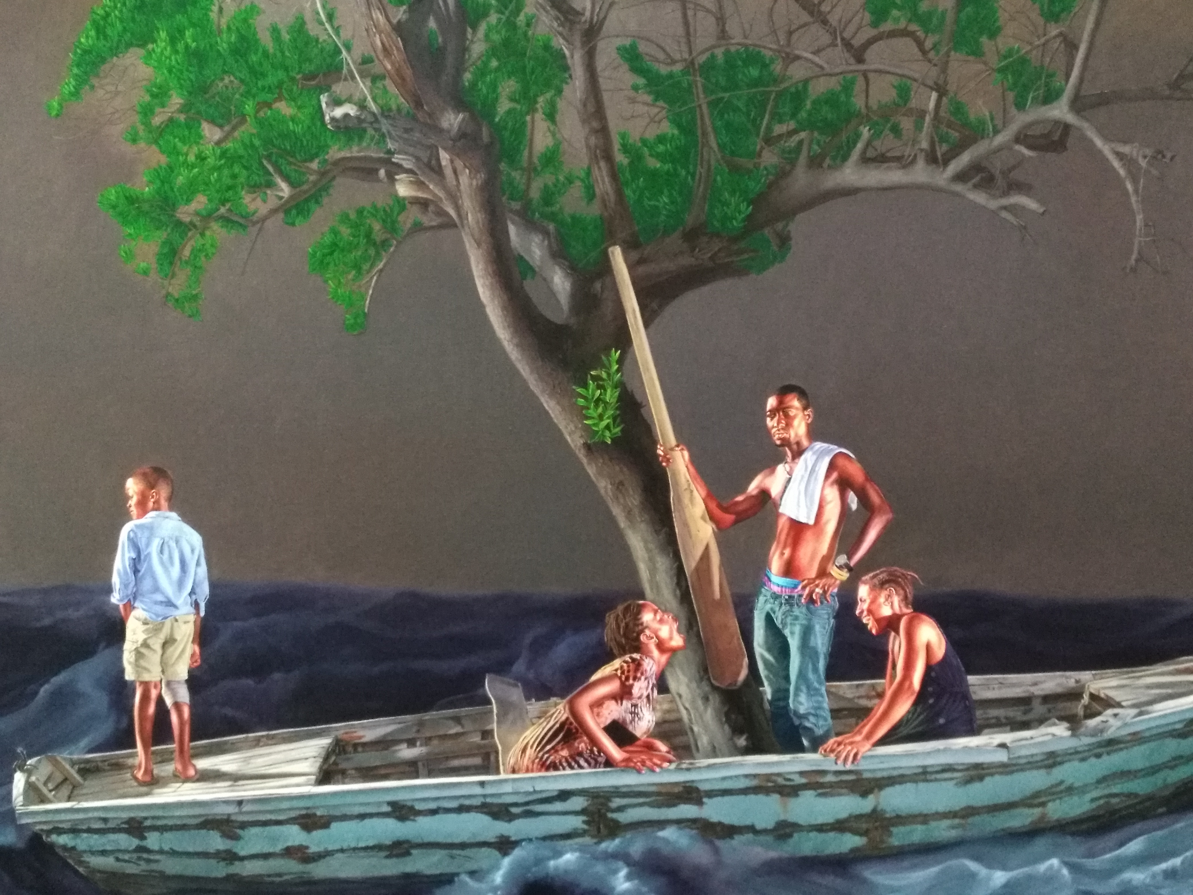 Detail from ‘Ship of Fools’ (2017) by Kehinde Wiley; contrasted with ‘Ship of Fools’ by Hieronymus Bosch (c. 1500-10).