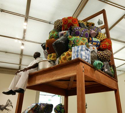 The inclusion of this quotidian polyvinyl fabric evoked memories of its use by other internationally renowned contemporary visual artists from continental Africa and the diaspora when addressing similar themes to Grada’s Illusions. For example, the portfolio of Cameroonian painter and mixed-media artist Barthélémy Toguo includes the sculptural installations Climbing Down (2005) and Redemption (2012), which both feature assemblages of the PVC bags, interspersed with Dutch Wax printed cotton fabrics and other culturally significant materials and objects to draw attention to the socio-political and economic plight and precarious lived experiences of migrants, asylum seekers, undocumented workers and other oppressed communities in Europe.