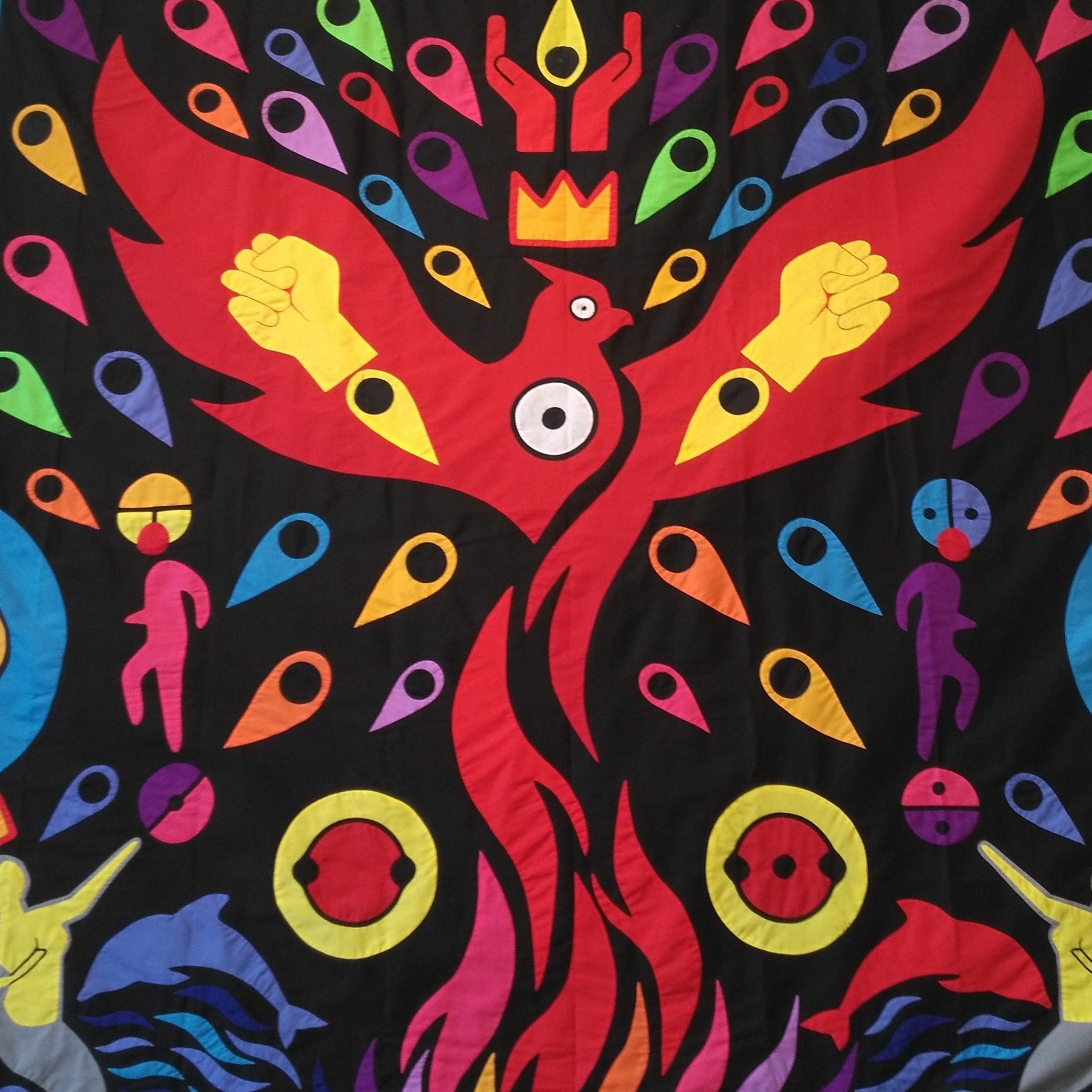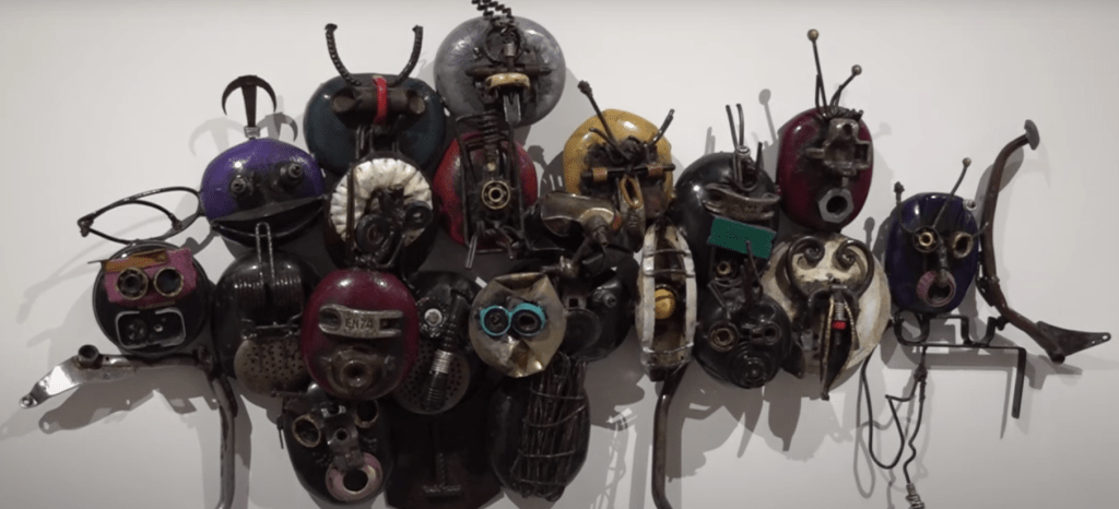 One hundred contemporary works by 34 visual artists from Benin and the Beninese diaspora were also presented alongside the returned treasures, enabling aesthetic links and continuities to be made between the past and the present while also opening up the exhibition as a space for dynamic, art-political, decolonial dialogues. Among the featured works were paintings by Cotonou-based figurative artist Moufouli Bello, fine art photography by Laeila Adjovi, textile-based wall-hangings and sculptural installations by Beninese-French artist Emo de Medeiros, and assemblages by the internationally renowned, Porto-Novo born, mixed-media artist Romuald Hazoumè.