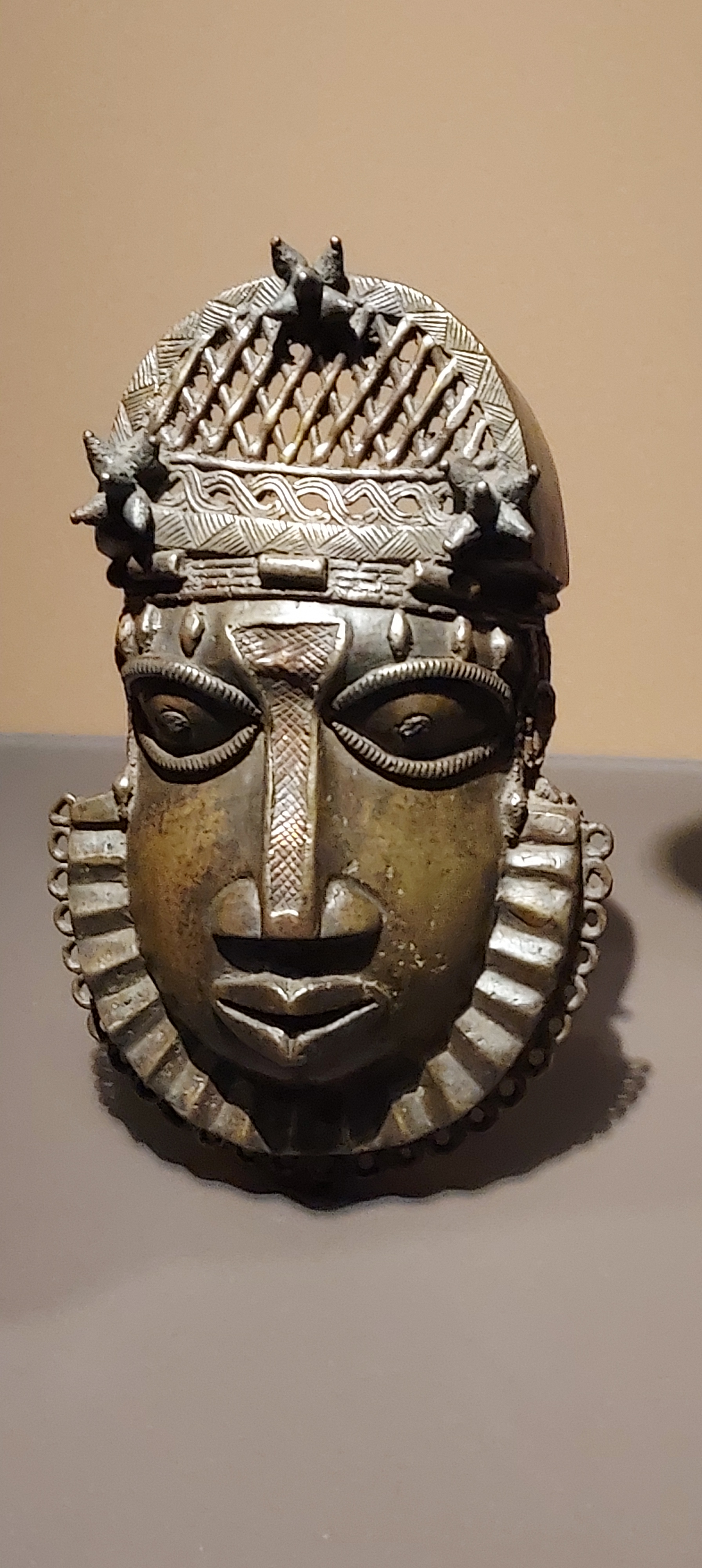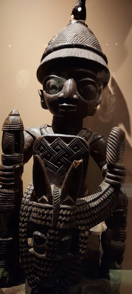 Among my personal highlights displayed in the Africa section were: a Beninese “Masque Gelede” woodcarving from the early 1900s; Nigerian sculptor Lamidi Fakeye’s mid-20th century equestrian figure of an Oba King “Ce roi-cavalier entouré de ses serviteurs“; an ornate wooden post from the palace of the Babanki Tungo kingdom in NW Cameroon, carved by the artist-king Fontshue Aseh (c. 1910s); and a late-19th century Yoruba, Ekiti area wooden sculpture depicting a priestess on horseback surrounded by musicians and followers.
