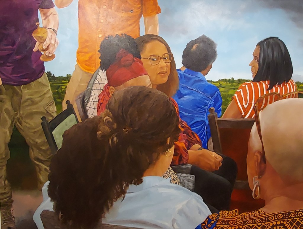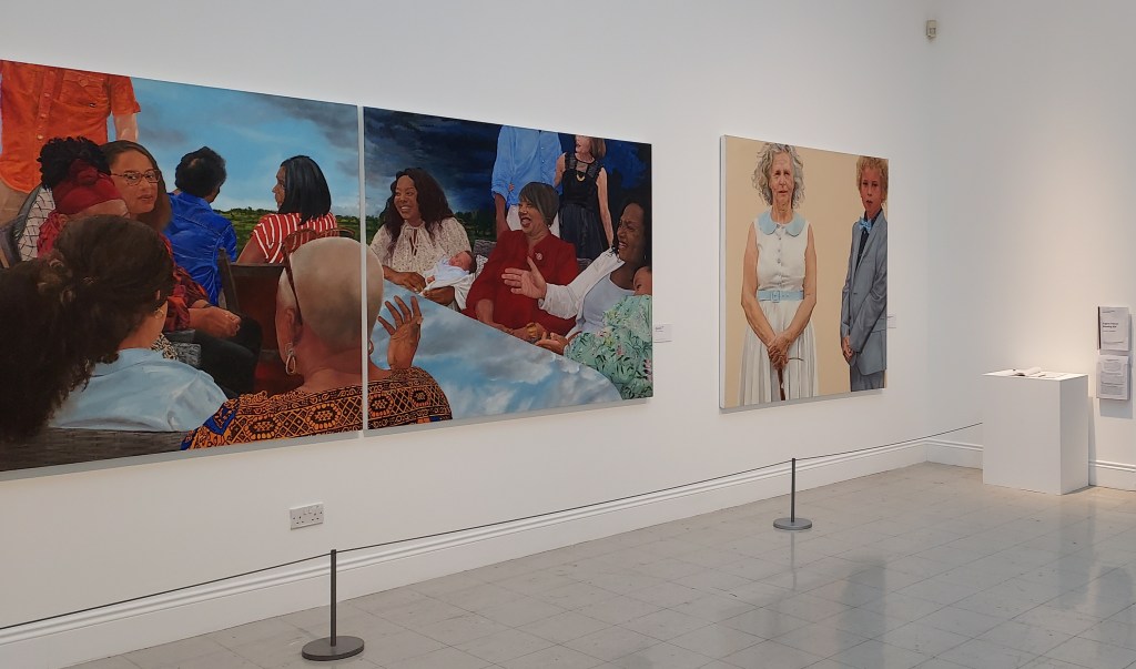 As the title suggests, themes about quietude, reflection and the visual poetics of resilience are discussed, in addition to considerations about the artworks’ wider social and cultural modalities. Several recurring motifs focused on representations of identity, belonging, sense of place, multiculturalism, relationality, intersectionalities of race and gender, intergenerational dynamics, diaspora and the legacies of empire are all foregrounded. The observations are documented via close examination of facial expressions, hand gestures, skin tones, stances, family resemblances and differences, characteristics of individuality and togetherness seen in the outfit styling choices, accessorisations and relative positionalities within (and beyond) each canvas – especially when thinking about the family as a microcosm of wider society: locally; nationally; and globally.