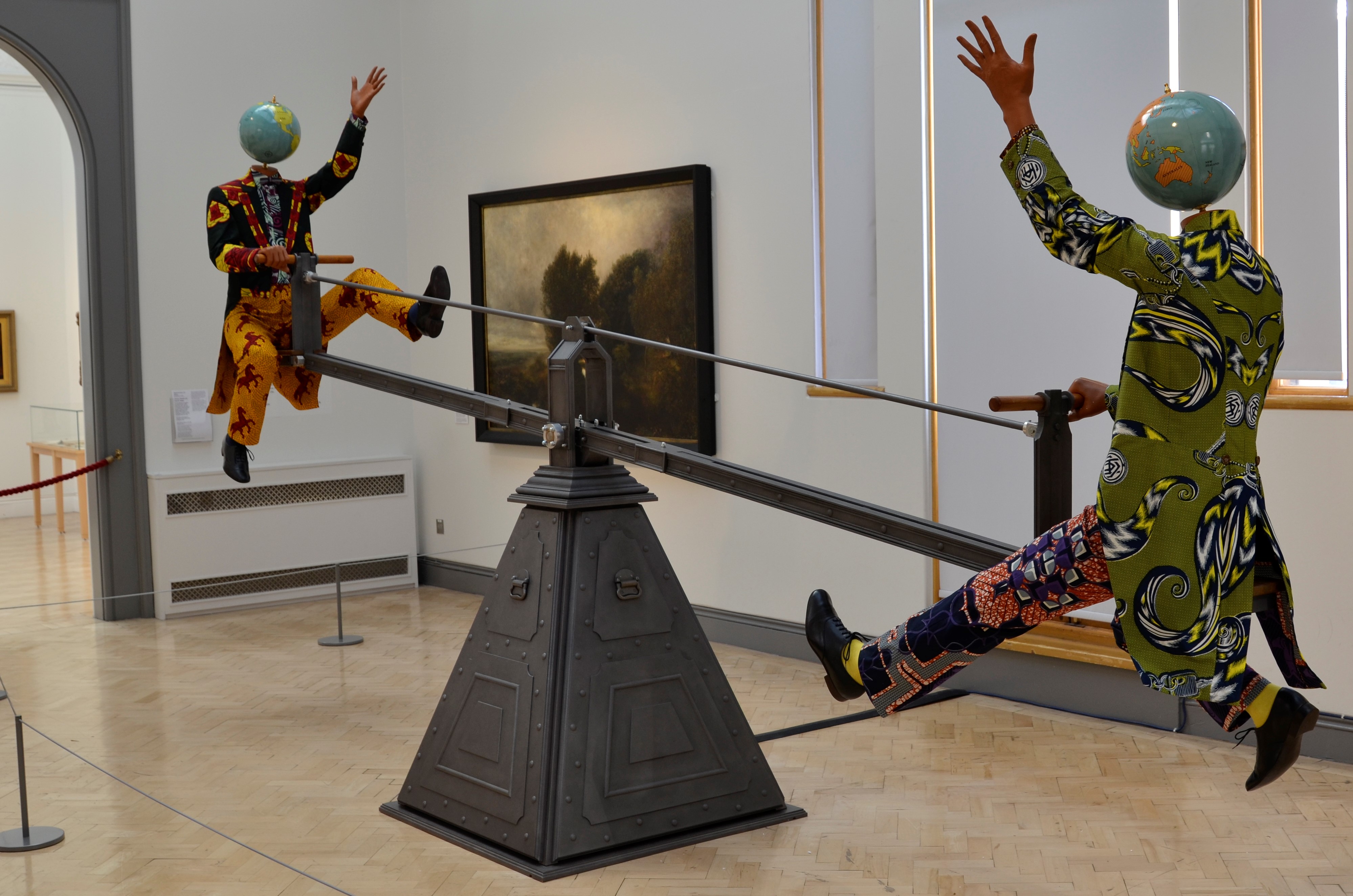 The sculpture comprises two ornately dressed mannequins seated at opposite ends of a riveted metal see-saw, with both of the characters positioned with outstretched arms as if in suspended animation, while the central hinged mechanism allows the moving apparatus to tilt from side-to-side at a slow-but-steady, metronomic pace. Both full-size mannequins are dressed in early-20th century Edwardian clothing fashioned from a variety of vibrantly coloured printed cotton fabrics, with globes replacing their heads. The world maps covering each globe-head depict the world’s geo-political borders as they were in 1917.