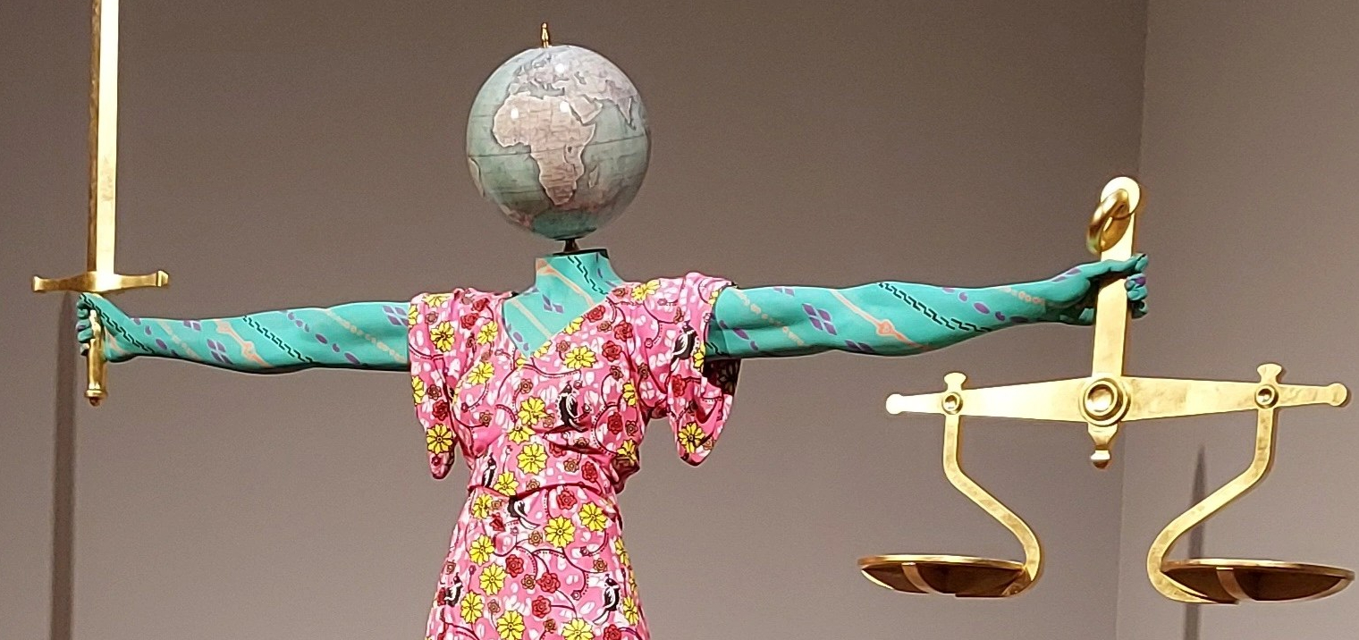 Two featured sculptures by Nigerian-British installationist Yinka Shonibare CBE both played with historical conventions that depict human progress and personify the concept of justice as a woman.